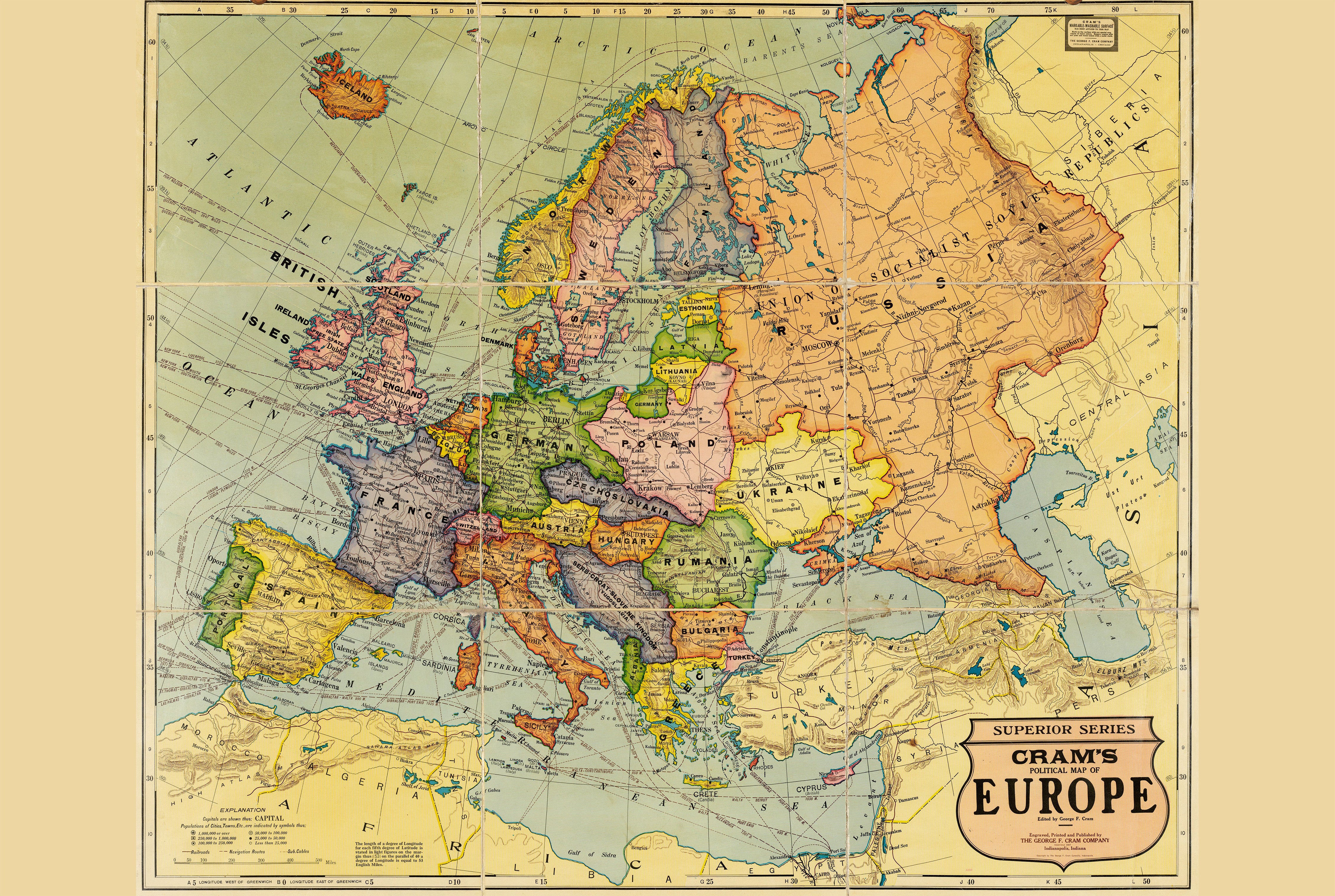 1925 Europa - Historyczna mapa ścienna z okresu międzywojennego